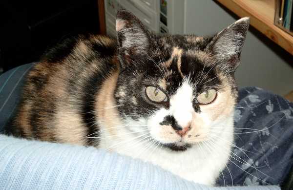 This is Söckchen, whose name means "Little Socks" in German. No, I can't remember why we named her that...she lived with us for eight, and we don't know either what she had done before that time or how old she really was. She just dropped by, highly pregnant, and left us with her litter. We decided to give them to the animal shelter, but she stayed with us. In fact, all our cats are strays...